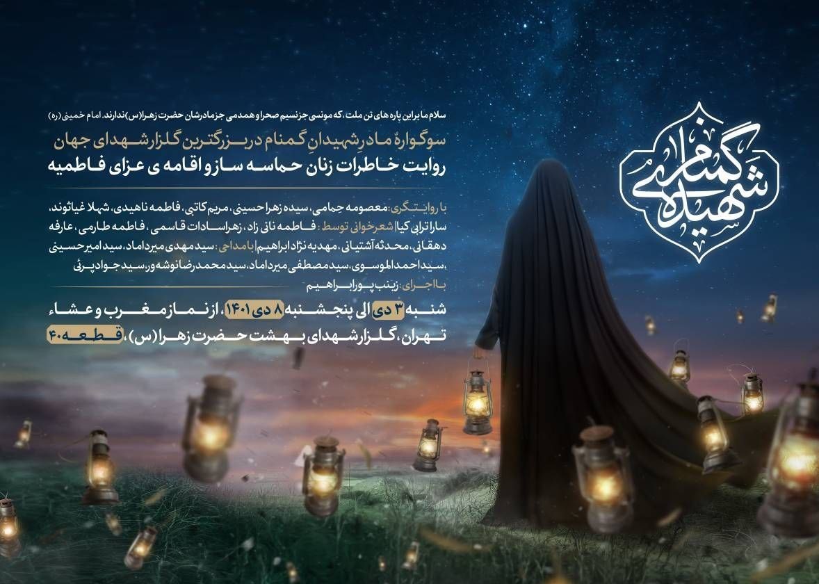به گزارش بقاع خبر، همزمان با ایام فاطمیه و فرا رسیدن شهادت مظلومانه حضرت زهرا سلام الله علیها، ویژه برنامه «شهیده گمنام» ویژه خانوادهها در بهشت زهرا (س) برگزار میشود. این برنامه سوگواره مادر شهیدان گمنام در گلزار شهدای بهشت زهرا (س) و روایت خاطرات زنان حماسهسازِ هشت سال دفاع مقدس است. همچنین عزای فاطمیه نیز در آن اقامه میشود.